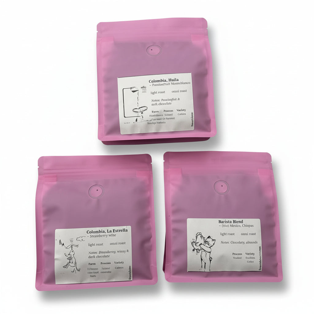 BOX 3 [€44] : 1x 250gr Barista blend, 1x 250gr Strawberry wine, 1x Passionfruit. (Barista blend; Nutty & Balanced // Strawberry wine; Chocolaty, winey, strawberry // Passionfruit; Fruity, Funky, Clean, Passionfruit & Milk chocolate)